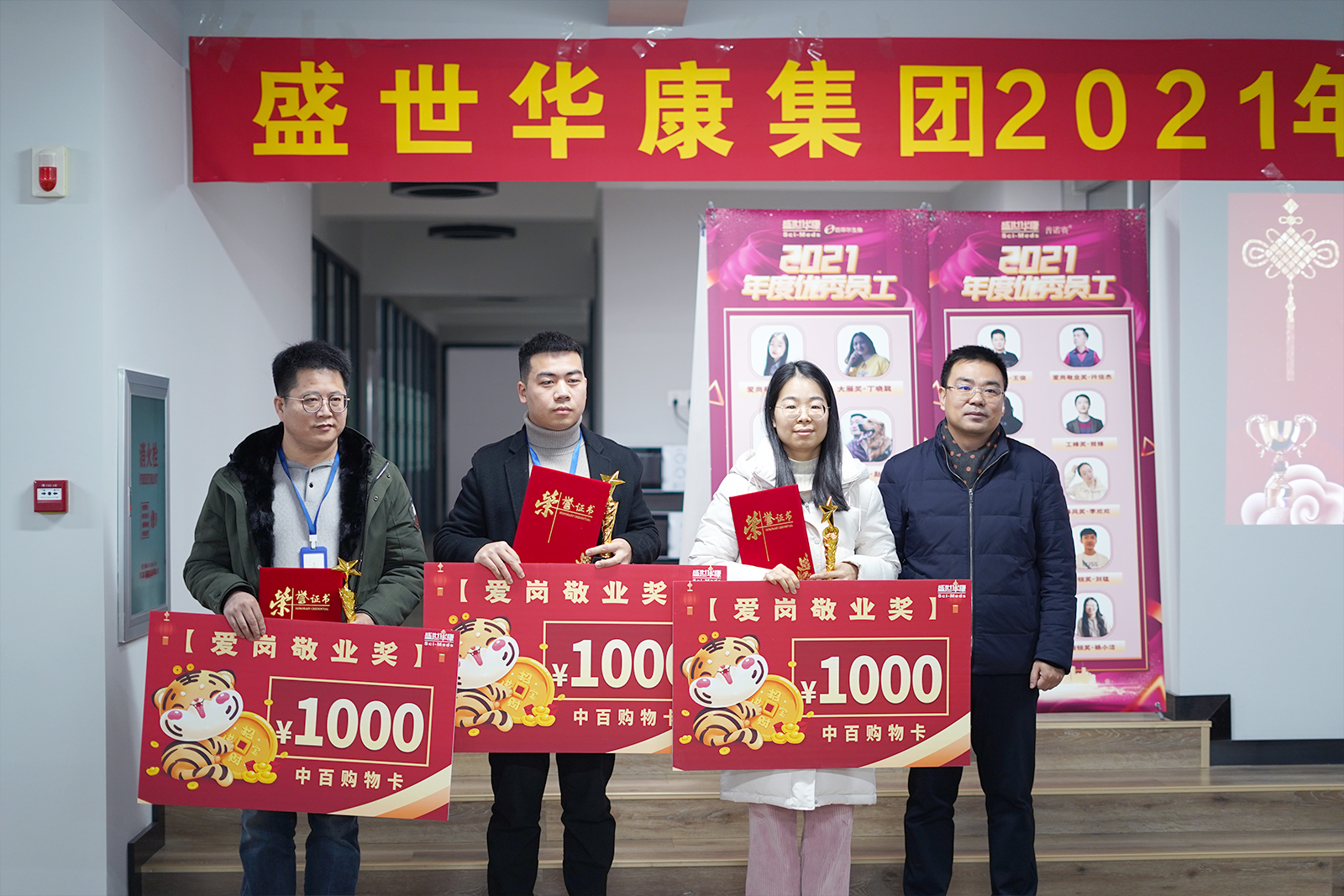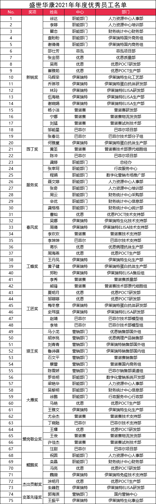 2021年是武汉盛世华康集团公司创新求变,突破发展的一年,是公司发展具有里程碑意义的一年。经过百年不遇的新冠疫情严峻挑战,在全体员工的共同努力下,公司业绩在2021年逆势上扬,在新品研发、市场开拓、产能提升、服务改进、信息化建设、培训与文化等方面涌现出了一批优秀团队和个人。为表彰优秀、鼓励先进,弘扬“开放进取、持续奋斗、团队合作、自我批判、至诚守信、成就客户”的企业价值观,不断提升盛世华康经营管理水平,集团公司各子公司/中心通过1个月严格的提名和评比,评选出了12个奖项共75位优秀员工,并于2022年1月22日和25日分两场成功举办了年终评优表彰大会,现将获奖人员信息公布如下: