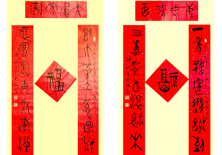 以下两幅春联,乃中国当代书画家、艺术评论家杨牧青先生以金文甲骨文为灵感源泉精心创作而成🎨。现在,就让我们一同尝试将其翻译成简体中文吧!