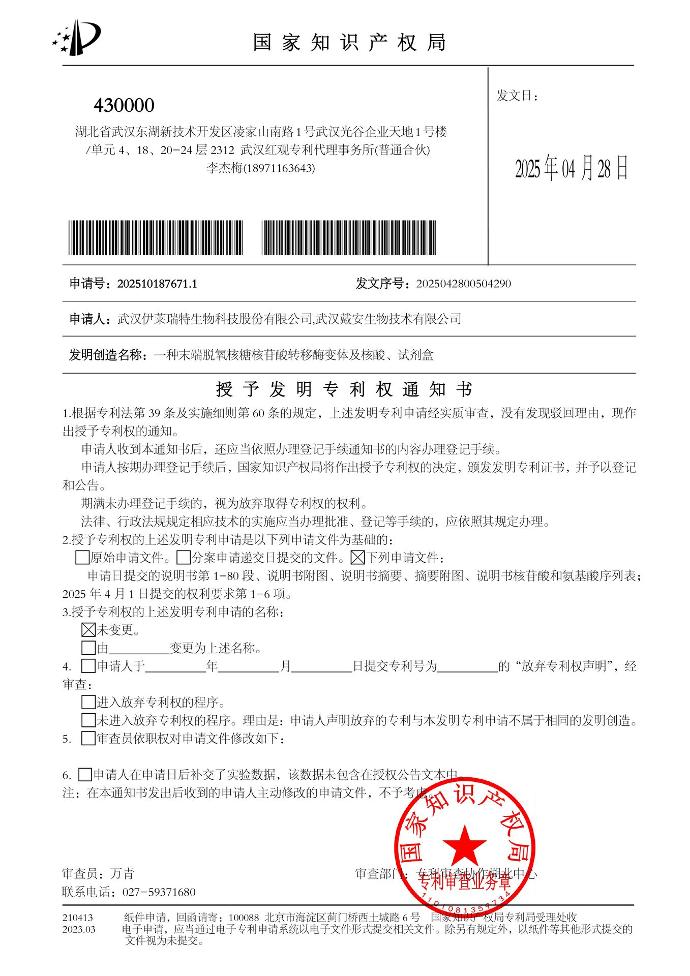 2025年4~5月,从国家知识产权局网站获悉,戴安公司《一种末端脱氧核糖核苷酸转移酶变体及核酸、试剂盒》、伊莱瑞特(武汉)公司《一种猴降钙素原重组蛋白、单克隆抗体及其制备方法和应用》,通过湖北省知识产权保护中心快速审查通道,均已获得授权。