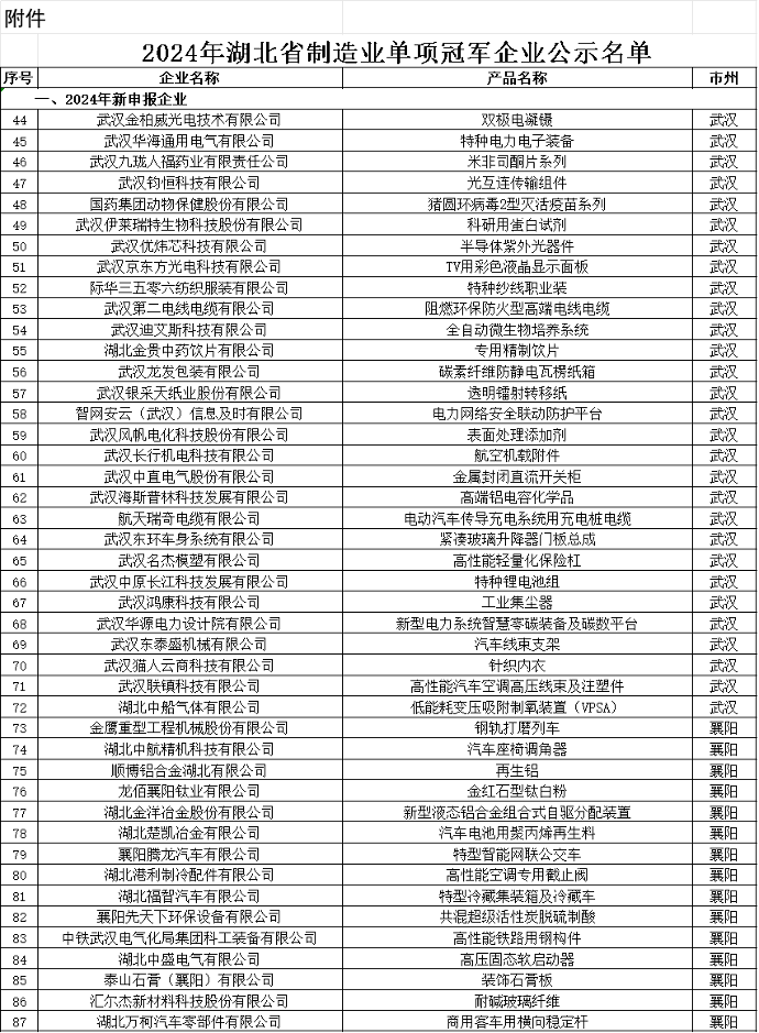 湖北省“制造业单项冠军企业”是指长期专注于制造业细分产品市场,生产技术或工艺国内领先,单项产品市场占有率位居全国(全省)前列的企业,被誉为“制造业皇冠上的明珠”“金字塔塔尖企业”,代表了湖北省制造业细分领域的最高发展水平和最强市场实力,含金量极高。
