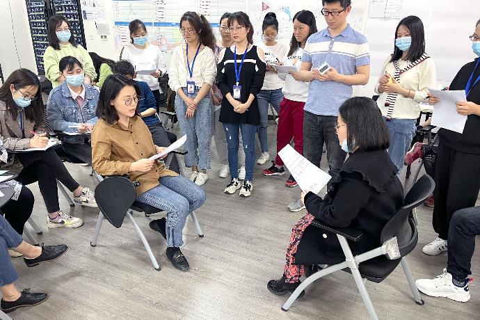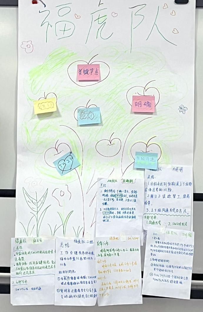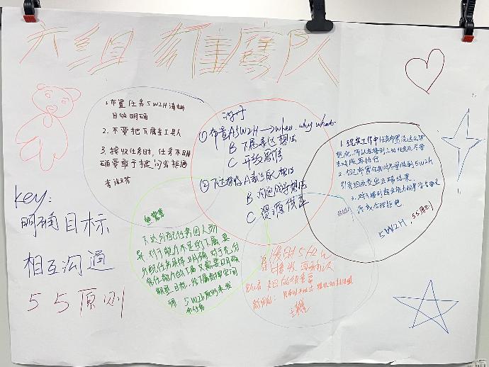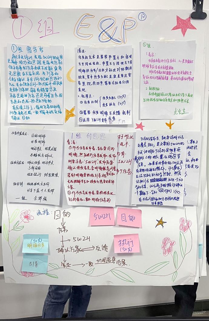 之后就进入到第一阶段集中学习的正式课程当中。培训期间,所有的小伙伴都全身心地投入,无论是课程讲授时,还是在共创讨论时,整个过程大家的参与度都非常高,有时候为一些共性的问题,大家会积极、激烈地讨论。第一阶段大家共创出了《主管/组长画像》,学习并展示了《工作中接收和明确任务的问题》,同时就《工作任务的布置和接收方式与反馈》进行情景演练。每一次的课中提问、每一次的共创研讨、每一次的上台展示,大家为了更好地反映问题、学习解决办法,每个人都沉浸在角色里。